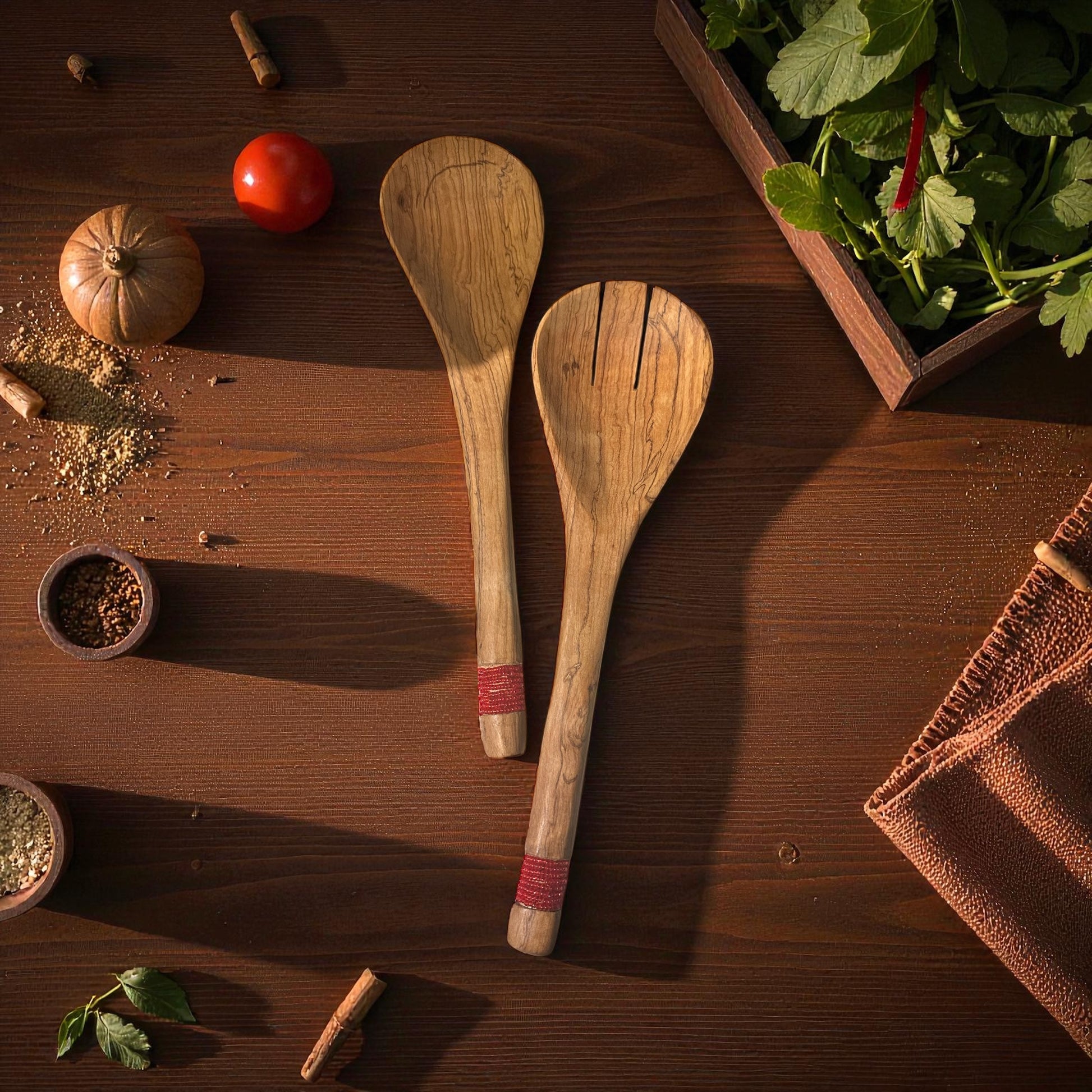 Handcrafted in Kenya, each set is carved from rich olive wood and adorned with vibrant beadwork that reflects the beauty of African artistry. Every piece tells its own story — no two sets are exactly alike, making each one a unique work of functional art.