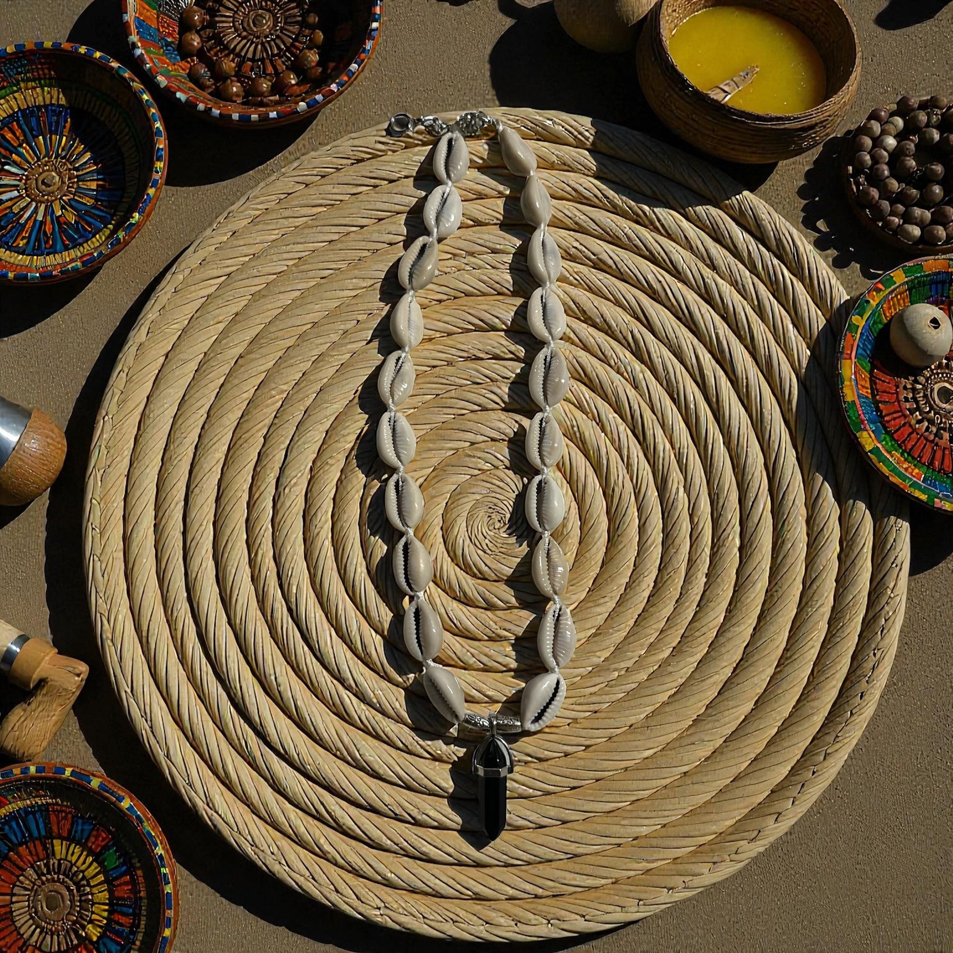 Step into your power with the Obsidian Tide Cowrie Necklace, a bold fusion of ancestral beauty and grounded energy. Handcrafted in Ghana, this statement piece blends natural cowrie shells — symbols of femininity, prosperity, and divine protection — with a sleek black obsidian pendant that anchors your energy with strength and peace.