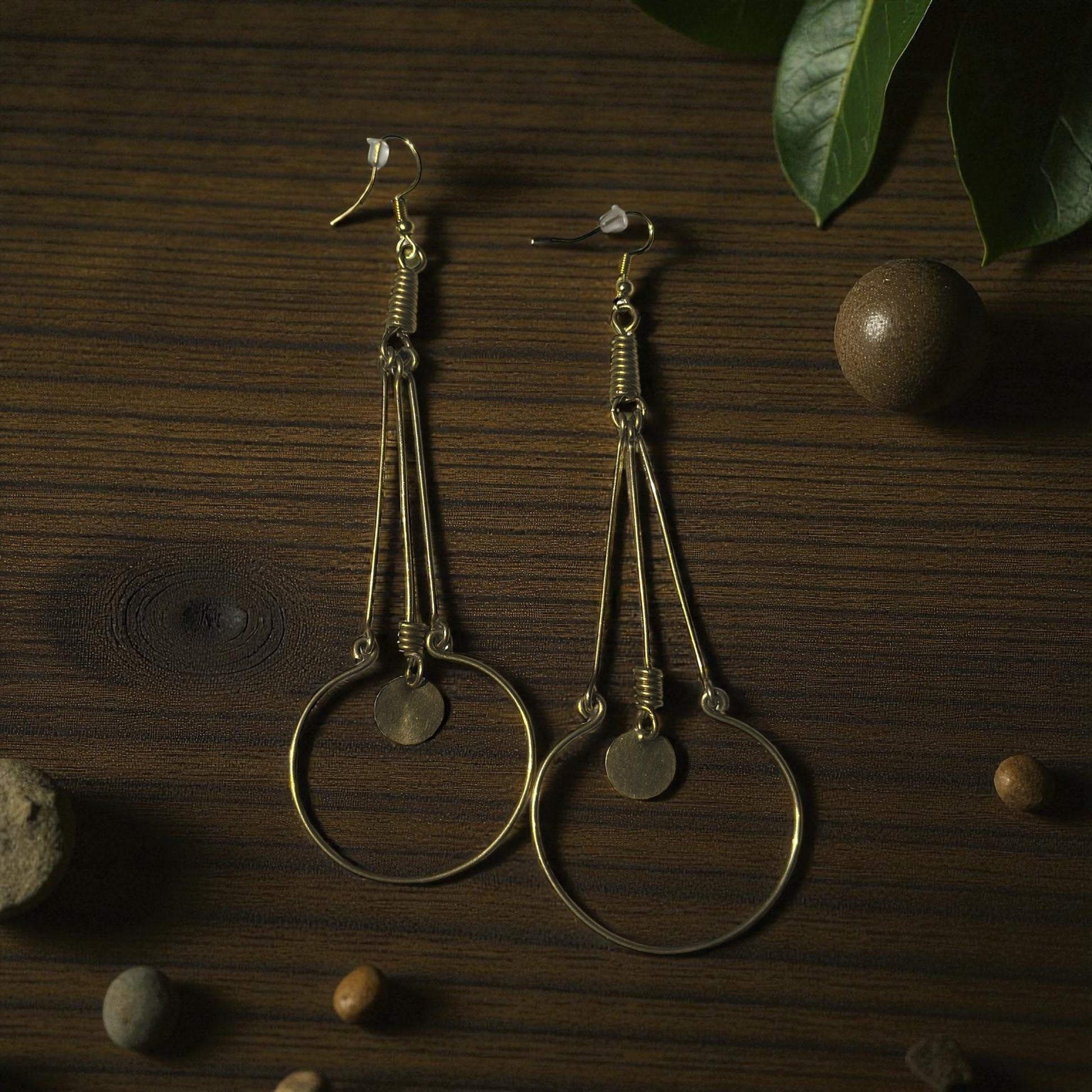 These earrings feature long brass rods that lead into an open circle — a symbol of wholeness, unity, and the cycles of life. The small disc charm adds gentle movement, catching the light with every step. Simple yet deeply symbolic, this pair embodies ancestral elegance with a modern twist.
