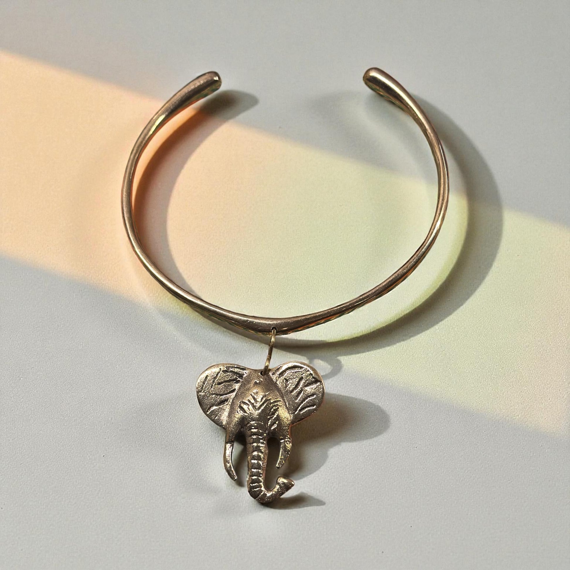 Brass collar necklace with elephant pendant.